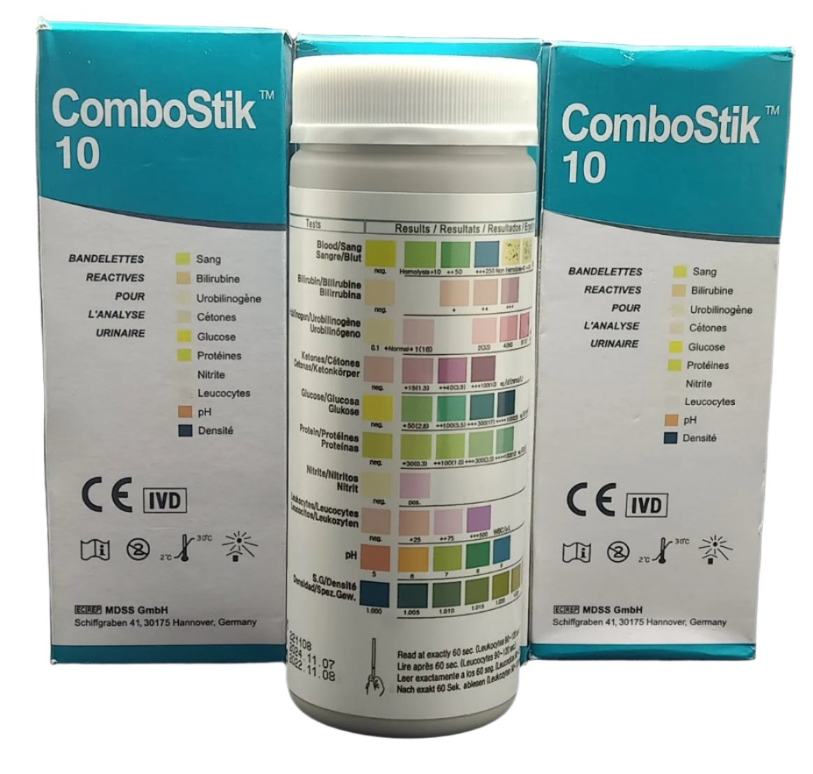 شرائط تحليل بول لتقييم 10 عوامل على شريط اختبار واحد. يمكن التحقق من العوامل التالية : الجلوكوز، والكيتون، والبيليروبين، والدم، وكريات الدم البيضاء، والنتريت، ودرجة الحموضة، والبروتين، والجاذبية النوعية، واليوروبيلينوجين.
