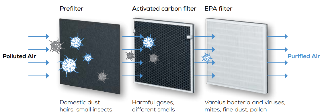 - تنظيف الهواء من خلال نظام فلتر ثلاثي الطبقات (الفلتر الأولي + فلتر الكربون المنشط + فلتر EPA*)